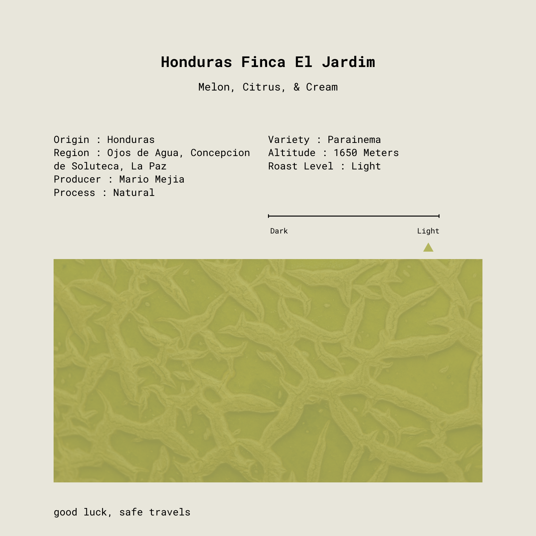 Finca El Jardin is located in the community of Ojos de Agua, Concepción de Soluteca, La Paz, Honduras, and is managed by Mario Mejia, a 24 year old, fourth-generation coffee grower. The farm consists of 32 hectares of land, sits at an elevation of 1,650 m.a.s.l, and boasts around 100,000 coffee trees in production of the Catuai, Pacas, IHCAFE90, Pacamara and a few special exotics he hopes to have in production in the coming years.